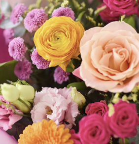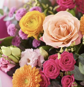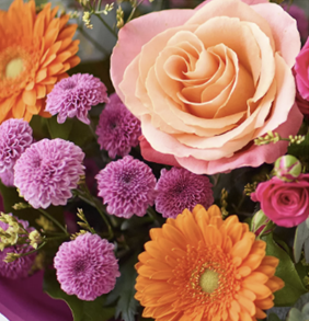 A joyful burst of colour, beautifully presented in a keepsake gift box. This hand-tied arrangement is packed with vibrant roses, cheerful germini, delicate spray blooms and fresh seasonal foliage in radiant shades of pink, orange, peach and yellow. Designed to be effortlessly elegant, the bouquet sits perfectly arranged in its decorative box – no vase required. A ready-to-display treat that’s as practical as it is beautiful, and the perfect way to brighten Mum’s day with something truly special.